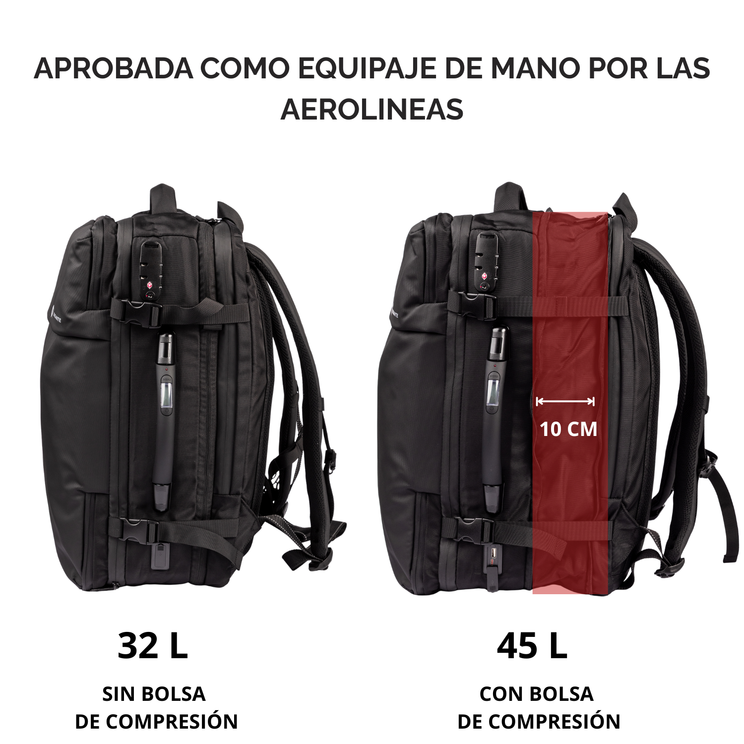 La VAGANTE AIRPACK MAX tiene una capacidad de expansión de 32 hasta 48 litros gracias a la bolsa de compresión, cuenta con múltiples compartimentos para ofrecer el espacio suficiente para llevar todo lo que necesitas de forma organizada y profesional, sin tener que facturar equipaje extra ni hacer largas filas.