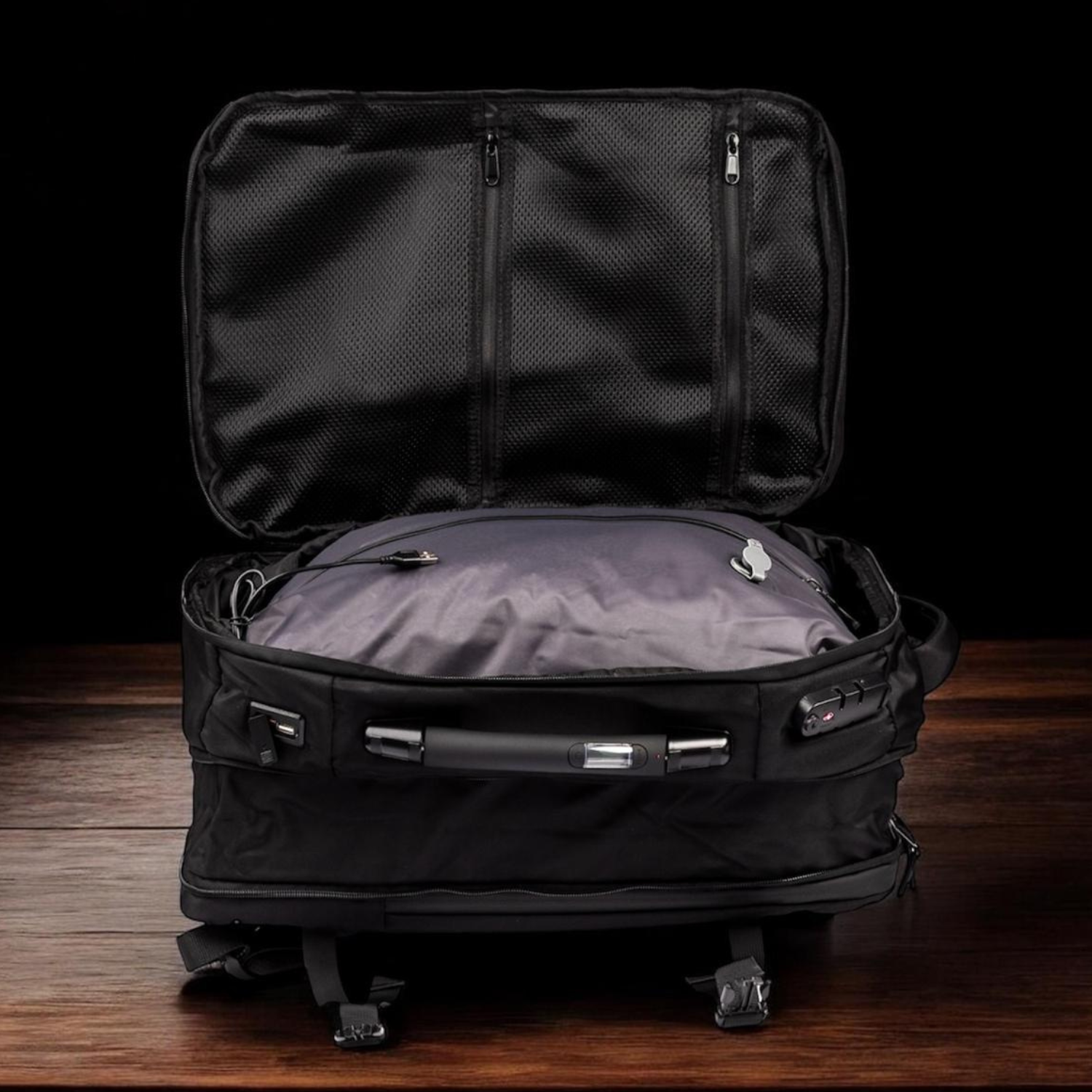 Nuestra VAGANTE AIRPACK MAX cuenta con una balanza incorporada, al levantar tu mochila sabrás el peso exacto, evita pagar extra por sobrecarga, también tiene candado para máxima seguridad. Toma de carga USB y tipo C, Un bolsillo aislado para tus zapatillas y además de un bolsillo secreto para tu pasaporte... Una mochila nunca antes vista en Chile.